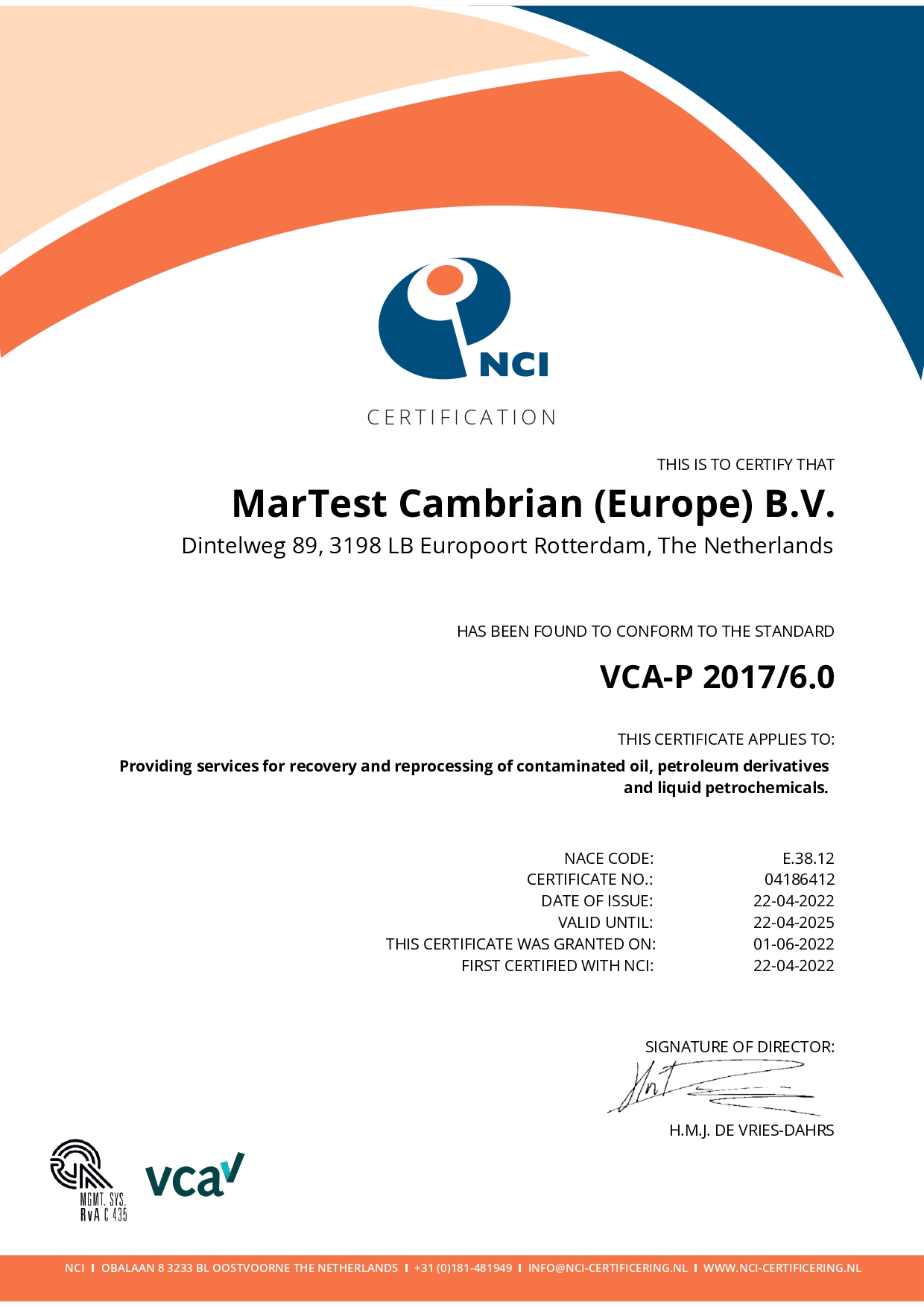 MarTest Cambrian Group is proud to be certified according to SCC-P and in combination with our ISO 45001, ISO-9001 and ISO-14001 certified procedures we try to offer our worldwide customers the safest and most efficient process possible